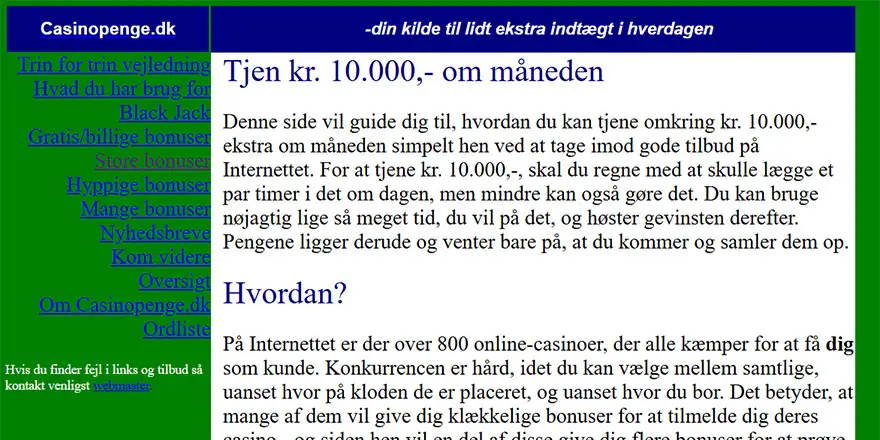 Herefter forklarer teksten kort, at der er 800 online casinoer i verden som alle kæmper om kunderne, og derfor giver umådeligt gavmilde bonusser. Ved at gå efter bonusserne og spille klogt (hvilket der også bliver instrueret i på siden), kan man - stort set uden risiko og med et par timers indsats om dagen - sikre sig en ekstraindtægt på 10.000 kr. om måneden.